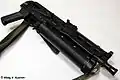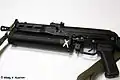 Оружие было создано на основе конструкции автомата Калашникова АКС74У (от которого заимствованы ствольная коробка и до 60 % остальных деталей), однако автоматика работает за счёт энергии отдачи свободного затвора. Внешней отличительной особенностью этого пистолета-пулемёта является шнековый подствольный магазин ёмкостью до 64 патронов. Дульный срез ствола оснащён компактным пламегасителем с двумя широкими прямоугольными окнами. Ствольная накладка пластмассовая[4].