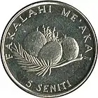 1967, 1968—1974, 1975—1980, 1981—2005 | с 1967: год чеканки, портрет и имя королевы Салоте Тупоу III, с 1968: год чеканки, имя и портрет короля Тауфа’ахау Тупоу IV в профиль, В 1975—2005: год чеканки, курица с четырьмя цыплятами и слово TONGA. | с 1967: в центре цифра 5, внизу слово SENITI, вверху слово TONGA, по бокам лавровые ветви; с 1975 сверху надпись «Fakalahi meakai» («производить больше продуктов питания»), в центре большая связка бананов, внизу номинал. В 1981—2005 в центре изображение кокосов, сверху надпись «Fakalahi meakai», внизу номинал. | |