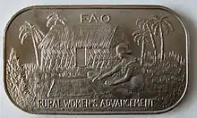 1980 | по бокам дважды слово PAANGA, внизу слово TONGA и год чеканки, портрет королевы Салоте Тупоу III. | вверху слово F.A.O., внизу фраза RURAL WOMEN’S ADVANCEMENT, в центре женщина возле хижины раскрашивает циновку. | |