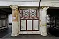 Снаружи часть дома, занятая вестибюлем, оформлена глубоким портиком на широких и тонких пилонах-простенках и со сводчатыми проходами[5].