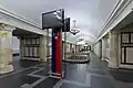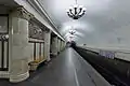 Массивные кубические пилоны облицованы светлым мрамором «коелга» и коричневым мрамором; по углам они украшены декоративными трёхчетвертными колоннами светлого мрамора с коринфскими капителями[7]. Светлые пилоны дополнительно декорированы геометрическим орнаментом красного с белыми включениями мрамора месторождения Салиэти[2], который скрывает вентиляционные решётки. Они несут общее перекрытие, на которые опираются относительно пологие разновысотные своды центрального и боковых залов. Межпилонные проходы простых прямоугольных форм перекрыты куполами и первоначально подсвечивались[6]. Путевые стены наполовину облицованы коелгинским мрамором[2]. Залы освещаются десятирожковыми люстрами, подвешенными по оси сводов[2].