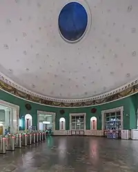 Круглый эскалаторный зал перекрыт куполом. В него открываются верхние арки эскалаторных тоннелей обеих станций, а также арочные проёмы, обозначающие входы и выходы[2]. Оставшиеся простенки заняты большими сводчатыми окнами. Поверхность купола украшена лепными розетками, к вершине уменьшающимися в размере, в центре — углубление синего цвета, создающее ощущение неба. Фриз под куполом украшен смальтовым панно (художник — И. А. Рабинович). Тема мозаики — «Сталинский план преобразования природы», на ней изображены гирлянды в виде хлебов, плодов, цветов, овощей. На карнизе над фризом ранее осуществлялась подсветка мозаики[3].