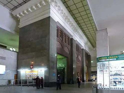 Одновременно был сооружён выход непосредственно в здание вокзала[20]. В настоящее время сохранившийся фасад южного вестибюля можно увидеть внутри здания Павелецкого вокзала (через левую арку ныне осуществляется выход, а правая не задействована в работе метрополитена).