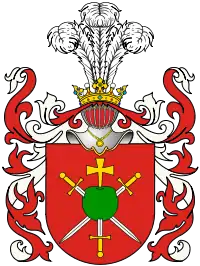 Состоит из трех мечей, пронзающих остриями положенный в красном поле шар. Рукоятки их, имеющие вид крестов, расходятся в три стороны. Между двумя верхними мечами виден крест. На шлеме пять страусовых перьев. Ср. Гербурт[1].