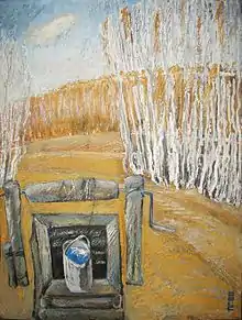 - Оберегая пространство. Основой произведений данной серии лежит образ креста. В рамках данной темы художник под разными углами рассматривает роль креста в русской культуре. Для этого художник пытается понять и осмыслить мировоззрение наших предков, начиная с древних земледельцев энеолита и заканчивая современной христианской традицией. Для первых крест был одним из древнейших выразителей оберегающей идеи пространства, окружающего нас со всех четырех сторон. Крест помещали внутри солнечного круга, чтобы обозначить повсеместность его света. До наших дней в языке сохранились выражения: «пустить на все четыре стороны», «со всех четырех сторон». В понимании христианина крест видится, прежде всего, как знамение страданий Христа и Его победы. Страдание — добровольное принятие Христом смерти на кресте. Победа — поражение дьявола, победа над смертью, сокрушение верей адовых, и Крест сделался общим спасением для всего мира.