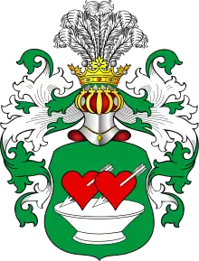 Щит увенчан дворянскими шлемом и короной. Нашлемник: пять страусовых перьев. Намет на щите зелёный, подложенный серебром.