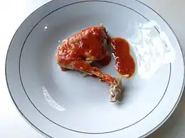 Ещё одним традиционным блюдом падангской кухни является барбекю из курицы в специях. Перед жаркой на углях крупные куски курятины маринуются в кокосовом молоке, заправленном специями, в число которых обязательно входит куркума. Для лучшей пропитки курятины маринадом ёмкость с ней обычно прогревают какое-то время на малом огне — подобная кулинарная технология применяется как в падангской, так и в некоторых других кухнях Индонезии. Благодаря куркуме куски курицы после приготовления приобретают весьма яркий желтый цвет, поэтому данное блюдо часто называют «жёлтой жареной курицей»[52]. Наряду с этим кушаньем в кухне минангкабау фигурирует и «зелёная курица», которая приобретает свой цвет благодаря обжарке в измельчённом недозрелом перце-чили[53].