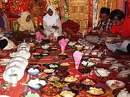 Трапезы, приуроченные к праздникам и иным значимым поводам, у минангкабау с кулинарной точки зрения принципиально не отличаются от повседневных. Кушанья в этих случаях также подаются в небольших тарелках и служат гарнирами к варёному рису, при этом их ассортимент обычно бывает более разнообразным, в ход идут более дорогие продукты. Непременным атрибутом праздничного стола являются разнообразные сладости. Однако основное отличие подобных трапез заключается именно в подаче блюд и соответствующем антураже[86][87].