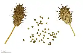Плод — боб, обратнояйцевидно-ромбический, в три раза длиннее чашечки, резко сужен в почти прямой носик, 2 мм длиной, со слабо заметными жилками.