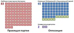 По результатам федеральных выборов 2 июля 2016 года, в которых всего участвовало 6 партий и блоков, правящая коалиция Национальной партии и Либеральной партии Австралии получила 42,15 % голосов избирателей. Лейбористская партия набрала 34,76 %. По итогам подсчета предпочтений коалиция получила 50,34 % голосов и 77 мест в Палате представителей, обеспечив себе большинство в 2 места, а лейбористы получили 49,66 % голосов и 68 мест, отвоевав у коалиции 12 мест. По одному месту в Палате представителей получили Австралийские зелёные (набрали 10,08 % голосов), «Команда Ника Ксенофона» и «Каттеровская Австралийская партия». Ещё два места заняли независимые кандидаты[1].