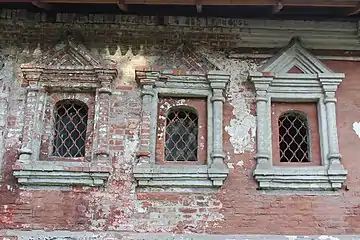 С западной и южной сторон у второго этажа имелось два отдельных входа, возле них хорошо сохранились ниши для свечей-фонарей. Оформление этажа богаче: окна украшены кирпичными наличниками с колонками и треугольными многопрофильными фронтонами. Между этажами выполнен горизонтальный пояс с поребриком. Кровля выходит далеко за плоскость стен, под ней проходит трехчастный кирпичный карниз[2].
