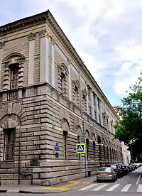 - Спроектировав знаменитый Дом Тарасова на улице Спиридоновка московский архитектор Иван Владиславович Жолтовский заимствовал формы уличных фасадов и саму структуру у палаццо Тьене. Строго симметричный, лишённый входных дверей фасад по Спиридоновке практически буквально воспроизводит рисунок фасада палаццо Тьене. Единственное изменение копии относительно прототипа — увеличенная высота первого этажа. Следуя пропорциям венецианского Дворца дожей, Жолтовский сделал первый этаж на 1/13 более высоким, чем второй — таким образом верхний этаж воспринимается облегчённым относительно массивного первого этажа. Как и почему Жолтовский выбрал за образец фасадов палаццо Тьене — осталось неизвестным[2].