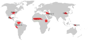 Между 9 и 5 тыс. лет назад произошёл переход части индейцев доисторической Бразилии к выращиванию некоторых сельхозкультур, ими были одомашнены маниок, гуава, кабачки[77]. Картофель был постепенно одомашнен на территории Боливии между 9 и 7 тыс. лет назад, откуда распространился по тропическим районам Южной Америки (территория Перу, Колумбии, Венесуэлы). В Центральной Америке около 7,5 тыс. лет назад была одомашнена кукуруза[78]. Индейка одомашнена майя около 2 тыс. лет назад[79]. Собака, вероятно, была приручена азиатскими предками палеоиндейцев ещё до их прихода в Америку и помогала им в охоте на крупных животных[80].