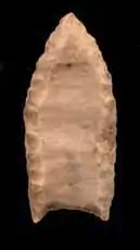 Палеолитическая культура Кловис, появившаяся примерно в 11 500 году до нашей эры[48], представители которой охотились в основном на крупных хоботных (мамонтов, мастодонтов и кювьерониусов), предположительно, сыграла одну из главных ролей в вымирании плейстоценовой мегафауны (в ходе раскопок найдены как минимум 12 «мест забоя и разделки хоботных», что является очень большим числом для такой кратковременной культуры, как Кловис)[3][49][50][51][52]. Именно в этой культуре впервые появляются первые каменные наконечники в Америке, имеющие острые и симметричные очертания с канавкой рядом с основанием, куда вдевалось древко копья. При этом технология изготовления копья оставалась одинаковой в течение нескольких сотен лет, что говорит о том, что знания о изготовлении копья передавались определённой группой мастеров. В какой-то момент такая система передачи знаний исчезает (вероятно, из-за исчезновения культуры Кловис), и разные племена начинают разрабатывать новые стили изготовления копья, которые, однако, не распространялись по континенту, как наконечники культуры Кловис, что можно объяснить снижением социального обучения и, вероятно, общими взаимодействиями между североамериканскими племенами[53].