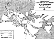 Северная Европа во время оледенения была закрыта ледником Фенно-Скандии, который достигал Британских островов на западе и среднего Поволжья на востоке. Ледники покрывали арктический шельф Сибири, омывающие её моря, все Альпы и многие горы Азии. Во время пика последнего оледенения, около 20 тыс. лет назад, существовавший в то время перешеек, соединяющий Азию и Америку, который носит название Берингия, также был покрыт ледником[14], что затрудняло проникновение человека в Северную Америку. Последняя, кроме того, была блокирована ледниками не только на севере Канады, но и на большей части Кордильер. В Южной Америке льды, наступающие из Антарктиды и спускающиеся с Анд, достигали равнин Патагонии. Льдами были покрыты Тасмания и Новая Зеландия. Даже в Африке ледники покрывали горы Кении, Эфиопии, Килиманджаро, Атлас и другие горные системы.