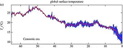 Тепловой максимум на границе палеоцена и эоцена длился 200 000 лет. Глобальная средняя температура поднялась на 5-8 °C,[25] в средних и полярных широтах стало теплее чем в современных тропиках, до 24-29 °C.[59] Это было вызвано выбросом в атмосферу 2,5-4,5 трлн тонн углерода, выброс случился из-за высвобождения метан-гидратов в северной части Атлантического океана. Это связано с тектонической активностью в регионе. Метангидраты выбрасывались 2500 лет,[59] в океане повысилась кислотность, течения замедлялись и это вызывало расширение зон с минимальным содержанием кислорода на больших глубинах. На мелководье в силу повышения температуры так же падало содержание кислорода в воде, а продуктивность океана в целом выросла в силу повышения температуры. Возникла острая конкуренция за кислород, в результате развивались сульфатредуцирующие бактерии, они создают как отходы высокотоксичный сероводород. Как итог объём воды с повышенным содержанием сульфатов вырос до 10-20 % объёма всего океана, в современный период объём такой воды составляет 1 % — один из примеров это дно Чёрного моря. Вдоль континентов образовались зоны хемоклина, характеризующегося бескислородными водами, в которых могут жить только анаэробные организмы.[59][59][59][60][60]
