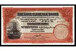 5 фунтов | 192 × 101 | Оранжевый | Аверс: Гильошированная виньетка; изображение Белой башни; текст «Валютный совет Палестины» на английском языке; текст «Банкноты являются законным платёжным средством для оплаты любой суммы» и «Пять палестинских фунтов (Земли Израильской)» на иврите, «Пять палестинских фунтов» на английском и арабском языках; текст «Иерусалим», «Собственность Валютного совета Палестины» и дата выпуска банкноты на английском; цифра «5» в современном начертании и традиционном арабском. Подписи. Реверс: Гильошированная виньетка; изображение Башни Давида; текст «Пять палестинских фунтов (Земли Израильской)» на иврите, «Пять палестинских фунтов» на английском и арабском языках; цифра «5» в современном начертании и традиционном арабском. |