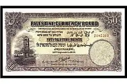 50 фунтов | 192 × 101 | Тёмно-фиолетовый | Аверс: Гильошированная виньетка; изображение Белой башни; текст «Валютный совет Палестины» на английском языке; текст «Банкноты являются законным платёжным средством для оплаты любой суммы» и «Пятьдесят палестинских фунтов (Земли Израильской)» на иврите, «Пятьдесят палестинских фунтов» на английском и арабском языках; текст «Иерусалим», «Собственность Валютного совета Палестины» и дата выпуска банкноты на английском; цифра «50» в современном начертании и традиционном арабском. Подписи. Реверс: Гильошированная виньетка; изображение Башни Давида; текст «Пятьдесят палестинских фунтов (Земли Израильской)» на иврите, «Пятьдесят палестинских фунтов» на английском и арабском языках; цифра «50» в современном начертании и традиционном арабском. |