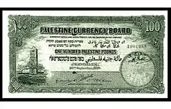 100 фунтов | 192 × 101 | Тёмно-зелёный | Аверс: Гильошированная виньетка; изображение Белой башни; текст «Валютный совет Палестины» на английском языке; текст «Банкноты являются законным платёжным средством для оплаты любой суммы» и «Сто палестинских фунтов (Земли Израильской)» на иврите, «Сто палестинских фунтов» на английском и арабском языках; текст «Иерусалим», «Собственность Валютного совета Палестины» и дата выпуска банкноты на английском; цифра «100» в современном начертании и традиционном арабском. Подписи. Реверс: Гильошированная виньетка; изображение Башни Давида; текст «Сто палестинских фунтов (Земли Израильской)» на иврите, «Сто палестинских фунтов» на английском и арабском языках; цифра «100» в современном начертании и традиционном арабском. |