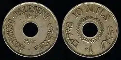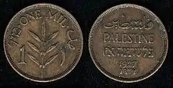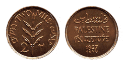 1 миль | 21,0 | 3,23 | Аверс: горизонтальный текст «Палестина» на арабском, английском и иврите; год выпуска в современном начертании и традиционными арабскими цифрами. Реверс: ветвь оливкового дерева (семь листьев, шесть ягод), цифра «1»; текст по кругу «Миль» на иврите и арабском, «Один миль» на английском; цифра «1» в традиционном арабском начертании. |