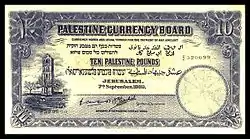10 фунтов | 192 × 101 | Тёмно-синий | Аверс: Гильошированная виньетка; изображение Белой башни; текст «Валютный совет Палестины» на английском языке; текст «Банкноты являются законным платёжным средством для оплаты любой суммы» и «Десять палестинских фунтов (Земли Израильской)» на иврите, «Десять палестинских фунтов» на английском и арабском языках; текст «Иерусалим», «Собственность Валютного совета Палестины» и дата выпуска банкноты на английском; цифра «10» в современном начертании и традиционном арабском. Подписи. Реверс: Гильошированная виньетка; изображение Башни Давида; текст «Десять палестинских фунтов (Земли Израильской)» на иврите, «Десять палестинских фунтов» на английском и арабском языках; цифра «10» в современном начертании и традиционном арабском. |