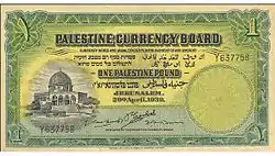 1 фунт | 165 × 89 | Зелёный | Аверс: Гильошированная виньетка; изображение Купола Скалы; текст «Валютный совет Палестины» на английском языке; текст «Банкноты являются законным платёжным средством для оплаты любой суммы» и «Один палестинский фунт (Земли Израильской)» на иврите, «Один палестинский фунт» на английском и арабском языках; текст «Иерусалим», «Собственность Валютного совета Палестины» и дата выпуска банкноты на английском; цифра «1» в современном начертании и традиционном арабском. Подписи. Реверс: Гильошированная виньетка; изображение Башни Давида; текст «Один палестинский фунт (Земли Израильской)» на иврите, «Один палестинский фунт» на английском и арабском языках; цифра «1» в современном начертании и традиционном арабском. |