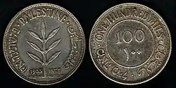 100 милей | 29,0 | 11,66 | Аверс: ветвь оливкового дерева (четыре листа, четыре ягоды), текст по кругу «Палестина» на арабском, английском и иврите; год выпуска в современном начертании и традиционными арабскими цифрами. Реверс: цифра «100»; текст по кругу «Сто милей» на иврите, арабском и английском языках; цифра «100» в традиционном арабском начертании. |