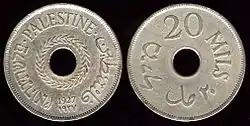 20 милей | 30,5 | 11,33 | Аверс: текст по кругу «Палестина» на арабском, английском и иврите; венок из листьев оливкового дерева, год выпуска в современном начертании и традиционными арабскими цифрами. Реверс: цифра «20»; текст по кругу «Миль» на иврите, арабском и английском языках. |