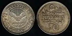 50 милей | 23,5 | 5,83 | Аверс: ветвь оливкового дерева (четыре листа, четыре ягоды), текст по кругу «Палестина» на арабском, английском и иврите; год выпуска в современном начертании и традиционными арабскими цифрами. Реверс: цифра «50»; горизонтальный текст «Пятьдесят милей» на иврите, арабском и английском языках; цифра «50» в традиционном арабском начертании. |