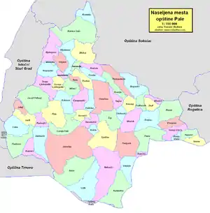 В состав общины входит 63 населённых пункта, в том числе город Пале[1][4][5].