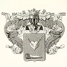 Щит увенчан дворянским коронованным шлемом. Нашлемник: рука в серебряных латах, вытянутая вверх, держит палицу натурального цвета. Намёт: лазуревый и красный, подложен золотом. Щитодержатели: два золотых льва.