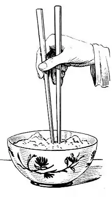 - Не следует передавать палочками еду другому человеку в тарелку или в принимающие чужие палочки. Этот жест используется для перекладывания близкими родственниками костей умершего после кремации в урну, и табуирован во всех других случаях.