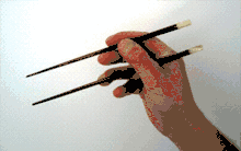 - Затем верхняя палочка кладётся на третью (ногтевую) фалангу среднего пальца, первую фалангу указательного, и придерживается кончиком большого; палочку нужно держать примерно как карандаш.