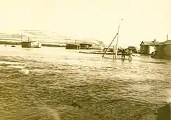 В посёлке находилось четыре небольших дома из бруса и нескольких утеплённых палаток, расположенных на берегу реки.