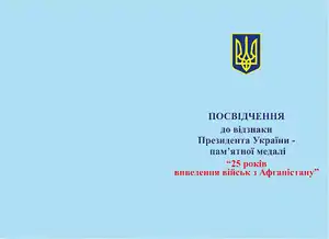 Знак отличия президента Украины — памятная медаль «25 лет вывода войск из Афганистана» учреждена указом президента Украины В. Ф. Януковича 14 февраля 2014 года. Тем же указом было постановлено наградить памятной медалью участников боевых действий на территории Республики Афганистан в период 1979—1989 годов и инвалидов войны из их числа.