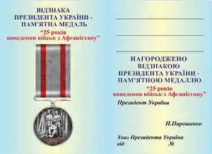- Знаком отличия президента Украины — памятной медалью «25 лет вывода войск из Афганистана» награждаются участники боевых действий на территории Республики Афганистан в период 1979—1989 годов и инвалиды войны из их числа.