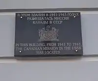 «В этом здании в 1941—1943 годах размещалась миссия Канады в СССР» - Расположение посольства Кубы в 1941—1943 годах (ул. Куйбышева, 129)