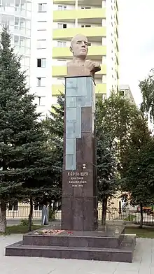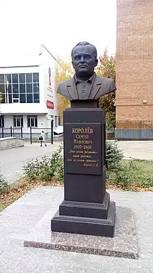 Бюст изготовлен из бетона, окрашенного под бронзу, установлена в рамках проекта «Аллея Российской славы». Вес бюста составляет около 1200 кг[4]. | ![]() Памятник Сергею Павловичу Королёву | |