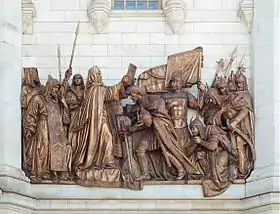 Одно из них — горельеф, изображающий посещение Дмитрием Донским Сергия Радонежского перед походом против татар, исполненный скульптором Логановским. Этот горельеф в своё время украшал московский Храм Христа Спасителя, был демонтирован перед тем, как храм взорвали, и сохранился до наших дней. На восстановленном храме установлена бронзовая копия этого горельефа (см. иллюстрации).