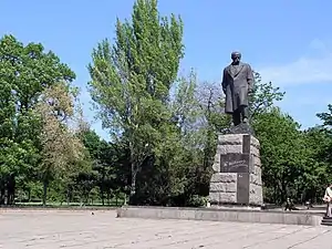 Памятник украинскому поэту и художнику Т. Г. Шевченко установлен в 1997 году у входа в парк, по улице Севастопольской. Он был передан в дар Симферополю от города Калуш Ивано-Франковской области. За внешний вид, цвет и своеобразные пропорции бюста и постамента, памятник у симферопольцев имеет прозвище «Спичка»[15]. | |