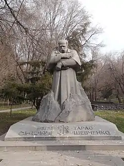 Памятник украинскому поэту Тарасу Шевченко в Алматы расположен на пересечении проспекта Достык и улицы Шевченко. Выполнен из гранита, который был добыт на Украине — в Житомирской области. Открыт в честь 9-й годовщины Независимости Украины по инициативе украинского посольства в Казахстане и алматинского акимата[32]. У памятника часто собираются этнические украинцы, проживающие в Алматы, которые проводят здесь памятные мероприятия и творческие вечера. Выполнен в виде волны, из которой выступает голова поэта[32].