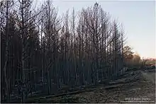 Фрагмент тольяттинского леса, уничтоженный в пожарах лета 2010 года - Памятник-бюст и стела писателю Николаю Островскому — были открыты 29 января 1973 года, ул. Новозаводская 7. Представлял собой стелу высотой 4 м из стали со словами: «Да здравствует пламя жизни» и бюст на постаменте. Постамент размерами 1 м × 0,8 м был сделан из бетона, бюст 1,2 м × 1,3 м — бетон, тонированный под бронзу. За спиной писателя находился барельефный портрет литературного героя — Павки Корчагина в будёновке. Автор — скульптор Н. И. Колесников. Представлял собой историческую ценность[59]. Демонтирован в 2000-х годах, остался только постамент.