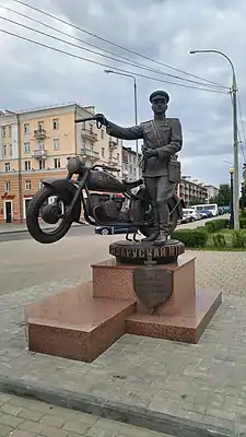 В городе Гомеле 9 ноября 2017 года[1] был открыт памятник, посвящённый 100-летию белорусской милиции. На изготовление памятника «100 лет белорусской милиции» ушёл почти год[1]. Бронзовая двухметровая скульптура[2] (2,1 м)[1], массой 1,3 тонн[1], появилась возле Дворца культуры железнодорожников на пересечении Привокзальной площади и улицы Привокзальной[1]. Главной в композиции является выразительная фигура старшего сержанта милиции в форме 1950-х годов с наградами участника Великой Отечественной войны: орден Красной Звезды, медали «За отвагу», « За боевые заслуги»[2]. Возле него — мотоцикл М-72, выпускаемый только для вооружения милиции.