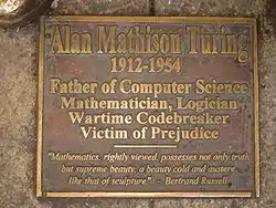 Мемориальная доска у ног статуи гласит: «Алан Мэтисон Тьюринг. Отец информатики, математик, логик, взломщик военных шифров, жертва предрассудков»[2].