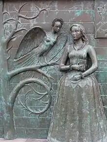 На бронзовой стене «разросся» куст терновника, его ветви — как длинные закрученные в полукружья шипы создают красивый орнамент. На кусте сидит мифическая птица Алконост с грудью и головой молодой женщины. На гладко убранных назад волосах — кокошник, но её лицо выглядит современно. Птица приподняла крылья и смотрит на Марину, которая внимает ей и будто углублена в свои мысли. Марина одета в старинное платье, но причёска современная. В руках она держит книгу «Владимир, или Прерванный полет»[8], из-под которой выползает змейка.