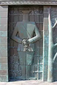 В левой части бронзовой стены — ниша, которую покрывает решетка. Перед ней спиной к нам стоит огромная (224 см) фигура милиционера в сапогах, галифе, кителе и портупее, на которой висит кобура. Руки Охранника сложены за спиной и держат связку ключей. Голова — шестигранная призма — напоминает болт, а фуражка — шляпку гвоздя.