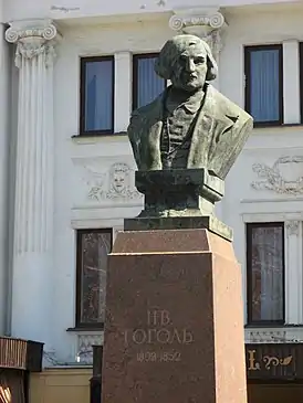 .. По совершению молебствия по распоряжению городского головы снимается завеса с памятника, которую сразу снять не удалось. Тысячи глаз с жадностью устремились на памятник, желая посмотреть того, память которого чтится, но завеса что-то плохо снимается. Вверху она слишком крепко зашпилена, почему выходит, что голова Гоголя будто спрятана в капюшон и не желает оттуда выглянуть. Наконец, при помощи лестницы, завеса спадает и перед взорами окружающих предстал Гоголь. Во многих замечается разочарование, которое они и не скрывают. «Как он не похож, только прическа Гоголя…» говорят они. Действительно, Гоголь на бюсте мало похож..