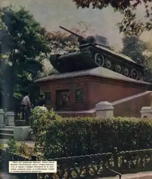 В 1964 году[8] на могиле появились высокий гранитный постамент и мраморные плиты с отлитой из металла надписью «Вечная слава героям, павшим в боях за свободу и независимость нашей Родины. 1941—1945». Некоторое время на новом постаменте стоял старый танк[9], но затем он был заменён на более современный танк Т-34-85, а боевой танк с Театральной площади переместили во двор краеведческого музея, который тогда располагался в одном здании с библиотекой имени Крупской.