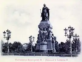 Автором первого памятника императрице Екатерине Великой был академик Императорской Академии Художеств Н. А. Лаверецкий. Возведение памятника было приурочено к столетнему юбилею присоединения Крыма к России. Работы велись на народные пожертвования. Существенную помощью в организации сбора средств, конкурса и строительства оказали Таврический губернатор Андрей Никитич Всеволожский, Таврический губернский предводитель дворянства В. В. Олив, Симферопольский предводитель дворянства Василий Попов. Василий Попов, как и губернатор, пожертвовал на сооружение памятника немало собственных средств. Монумент торжественно открылся 18 октября 1890 года на территории городского сада. Монумент представлял собой бронзовую статую императрицы на гранитном пьедестале. В правой руке Екатерина II держит скипетр и развёрнутую карту Крыма, левая - простёрта к городу. Вокруг подножья памятника располагались скульптуры государственных деятелей екатерининской эпохи, участвовавших в присоединении Крыма к России — князей Григория Потёмкина-Таврического и Василия Долгорукова-Крымского, полководца Александра Суворова, посланника России в Турции Якова Булгакова[1]