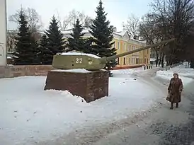 На невысоком постаменте из красного кирпича установлена башня танка, покрашенная в зелёный цвет. На башне нанесён номер «212» и знак «Гвардия». Сзади памятника — полукруглая стела с надписью «1941-1945 Слава Защитникам Отечества».